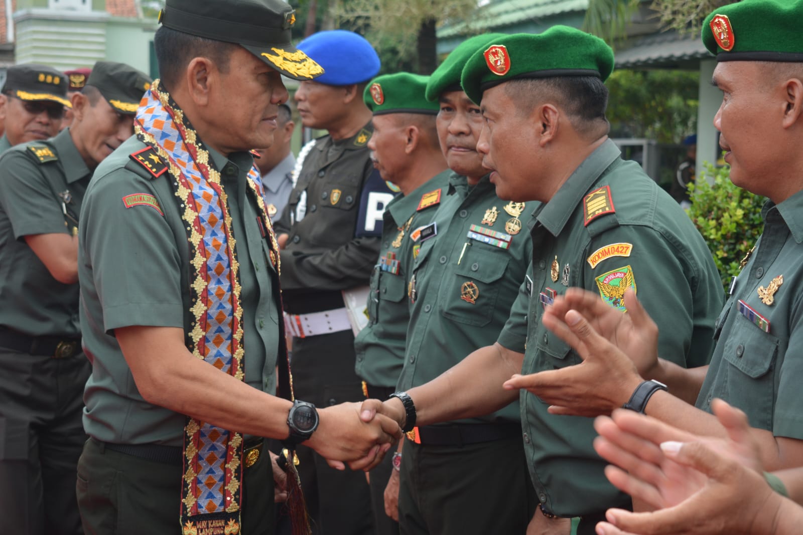 Setibanya Danrem beserta rombongan langsung disambut Dandim 0427/WK Letkol Inf Aan Fitriadi, S.I.P., dengan penghormatan dan laporan, kemudian acara tradisi pengalungan selendang tapis dan tarian Siger Pengunten dilanjutkan penyambutan oleh Bupati Way Kanan Raden Adipati Surya, S.H., M.M., beserta Forkopimda Kabupaten Way Kanan, para Danramil Jajaran Kodim 0427/WK dan para Perwira Staf Kodim 0427/WK.