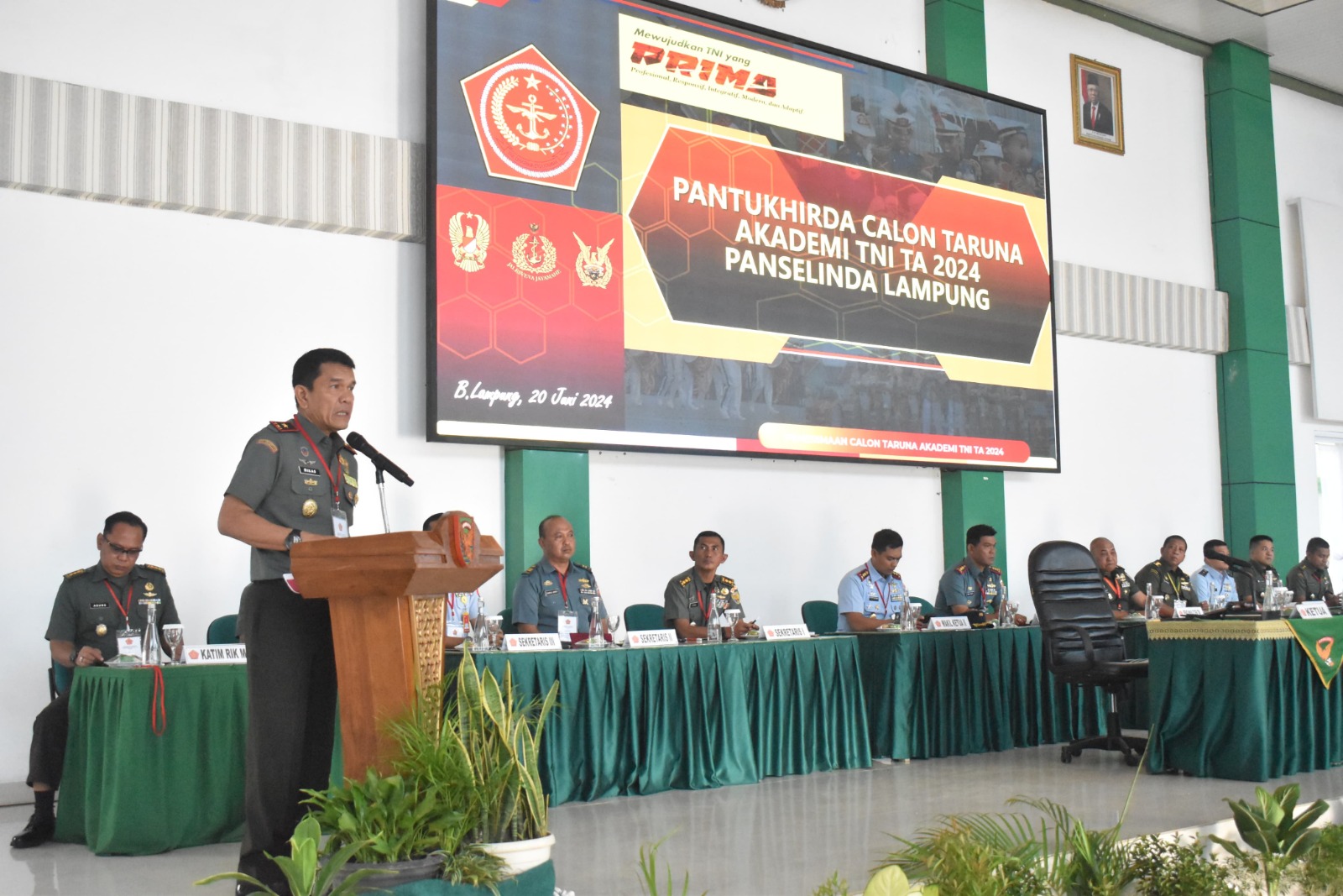 Lampung – Bertempat Aula Sudirman Makorem 043/Gatam Jl. Teuku Umar Penengahan Bandar Lampung, Komandan Korem 043/Gatam Brigjen TNI Rikas Hidayatullah, S.E., M.M., pimpin sidang Pantukhirda Calon Taruna Akademi TNI TA. 2024 Panselinda Lampung. Kamis (20/6/2024).