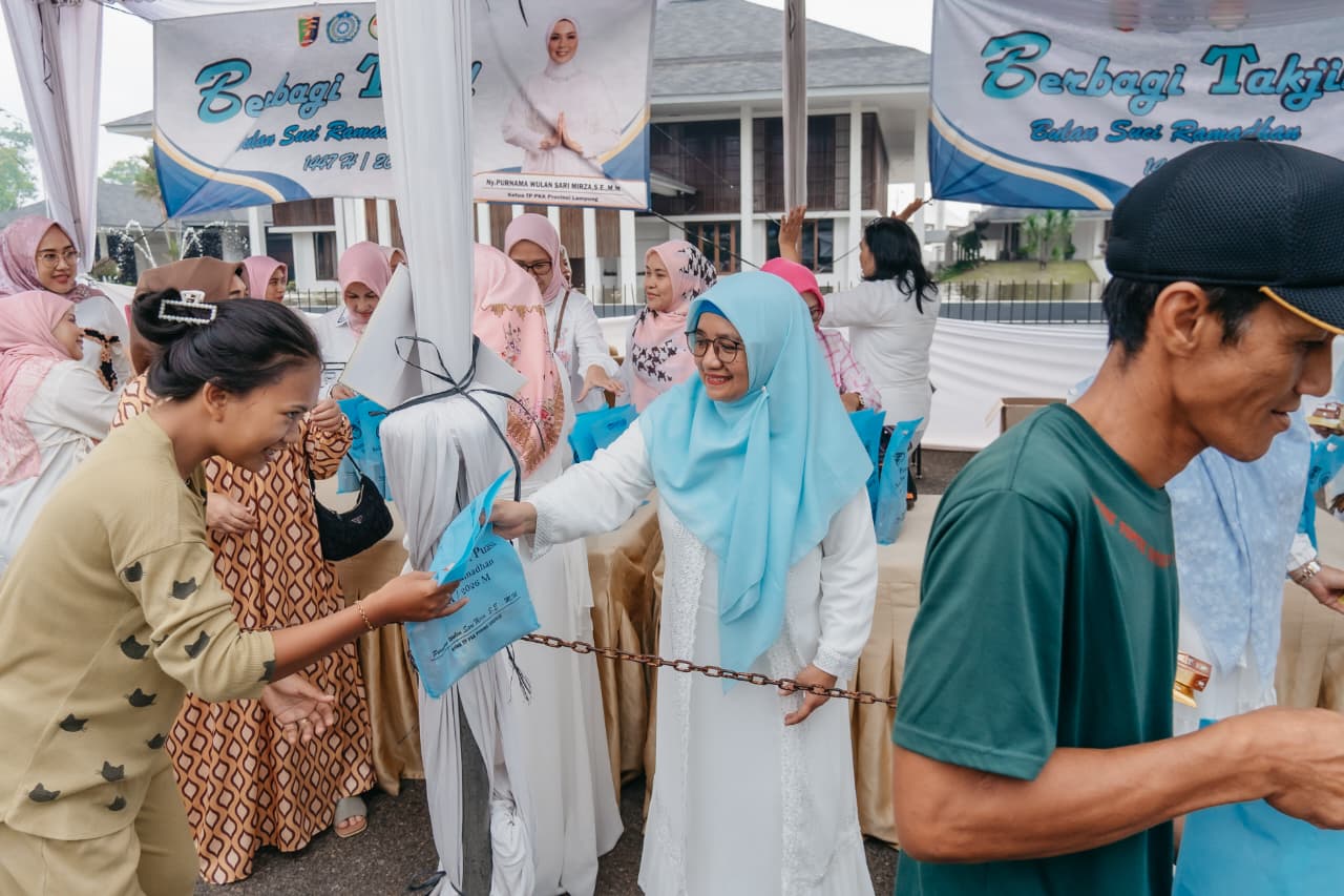 Bandar Lampung — Memasuki hari keenam pelaksanaan kegiatan berbagi takjil Ramadan 1447 Hijriah, Tim Penggerak PKK Provinsi Lampung bersama Dharma Wanita Persatuan (DWP) Provinsi Lampung kembali membagikan paket berbuka puasa kepada masyarakat di depan Mahan Agung, Minggu (01/03/2026).