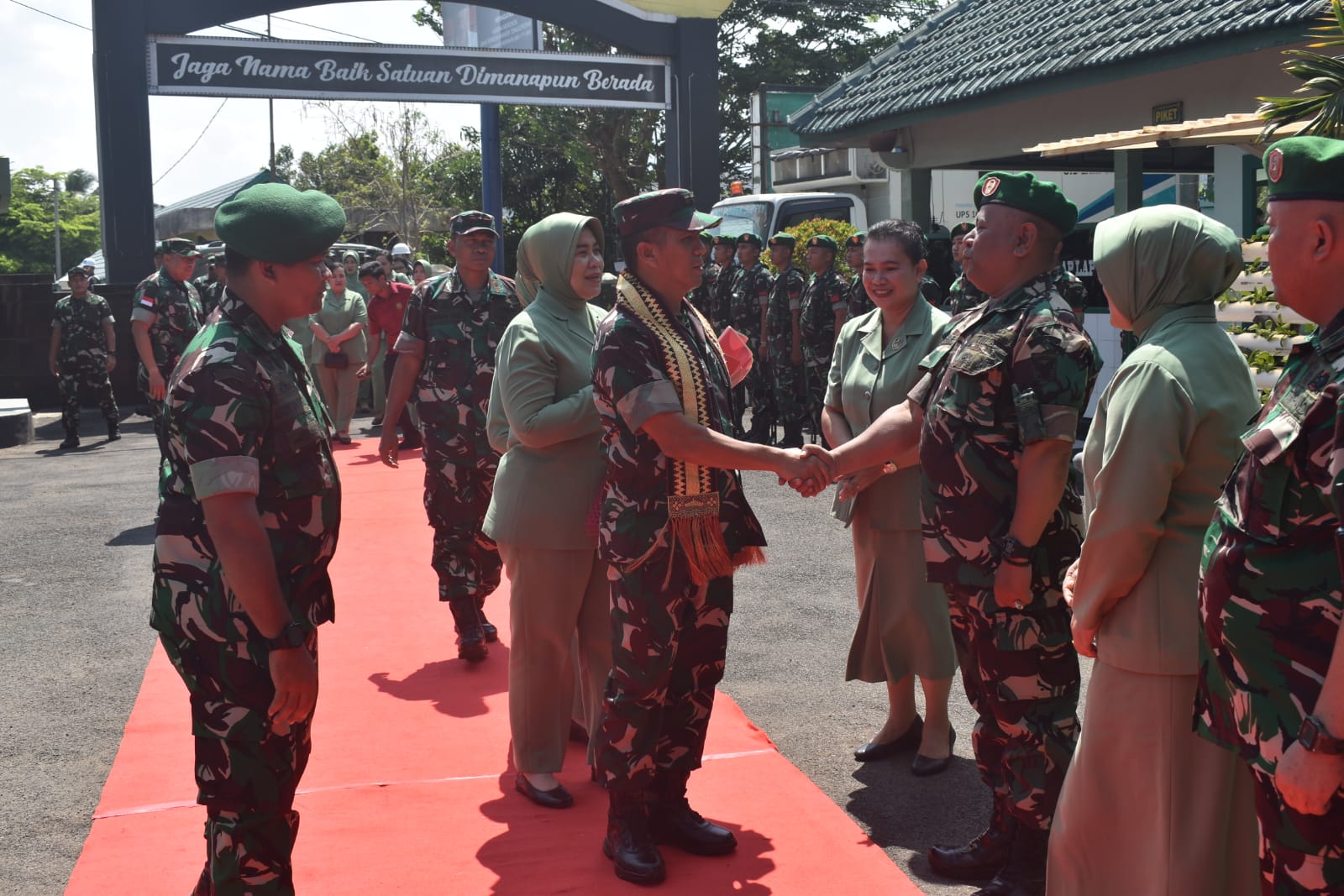 Setibanya di Kodim, Pangdam beserta rombongan langsung disambut Ws. Dandim 0410/KBL, Letkol inf Hendry Ginting S.I.P beserta Ibu Ketua Persit KCK Cabang XXX Dim 0410 Ibu Arum Tri Arto Subagio dengan pengalungan Tapis dan pemberian Handbucket.