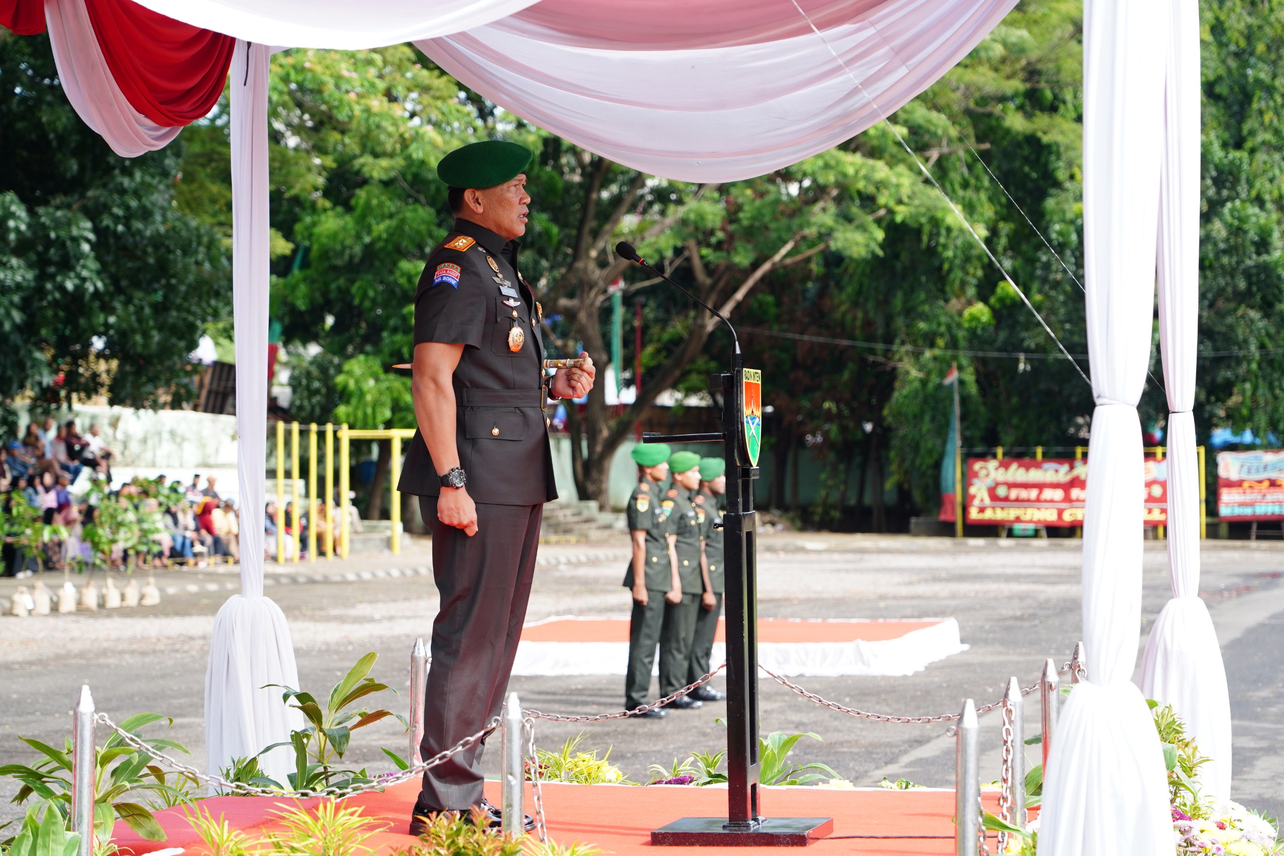 Bandar Lampung — Panglima Kodam XXI/Radin Inten, Mayjen TNI Kristomei Sianturi, S.Sos., bertindak selaku Inspektur Upacara pada peringatan Hari Juang TNI Angkatan Darat Tahun 2025 yang digelar di Lapangan Saburai, Kelurahan Enggal, Kecamatan Tanjung Karang Pusat, Kota Bandar Lampung, Senin (15/12/2025).