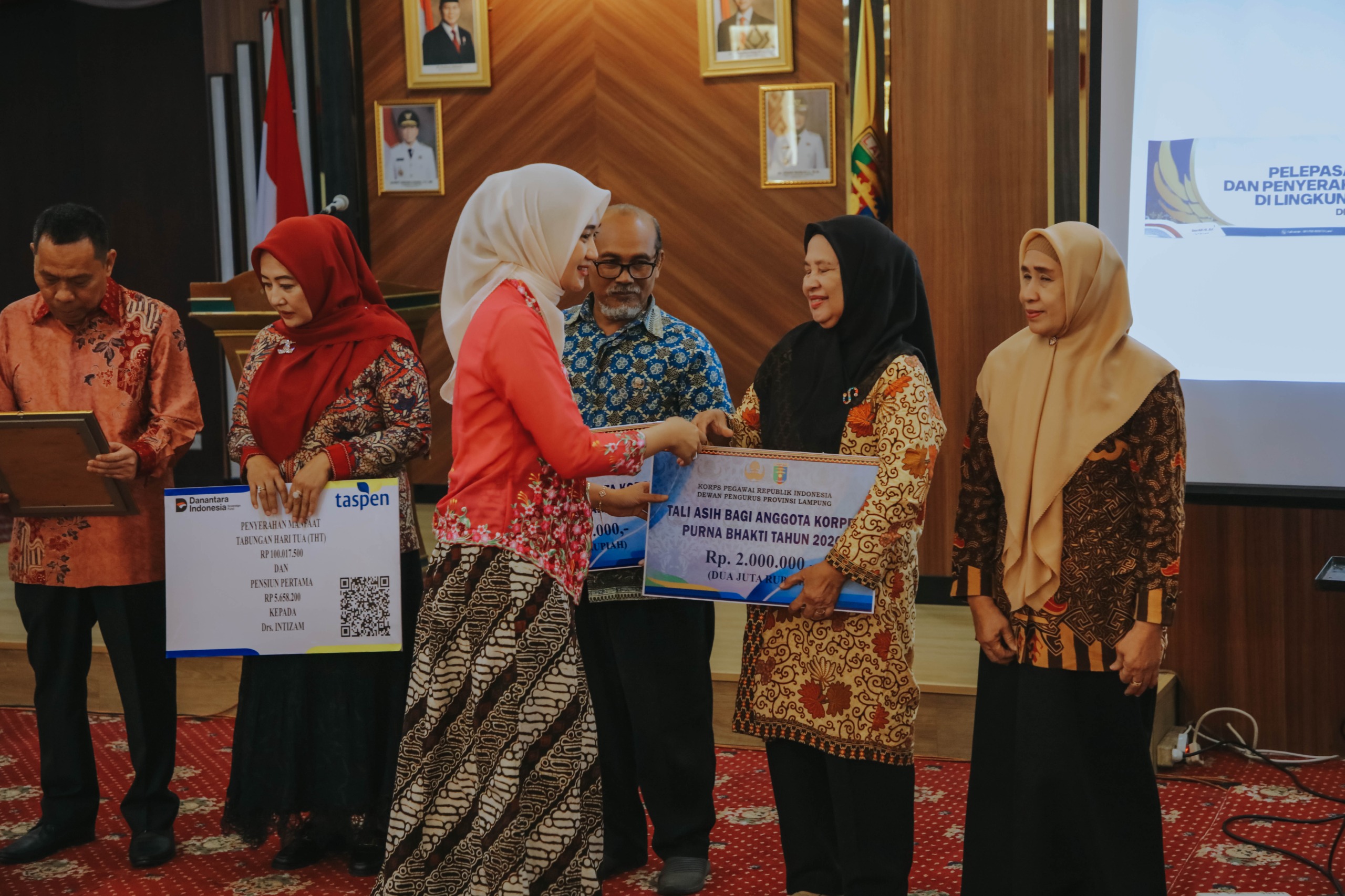 Wakil Gubernur Lampung Jihan Nurlela memimpin langsung prosesi pelepasan tersebut, yang dirangkaikan dengan penyerahan Surat Keputusan (SK) pensiun, piagam penghargaan, tali asih, serta Tunjangan Hari Tua (THT) kepada 42 Pegawai Negeri Sipil (PNS) yang memasuki masa pensiun terhitung mulai 1 Maret 2026. Selain itu, diserahkan pula santunan kepada tujuh keluarga anggota Korpri yang meninggal dunia serta dua santunan kepada istri anggota Korpri yang telah berpulang.