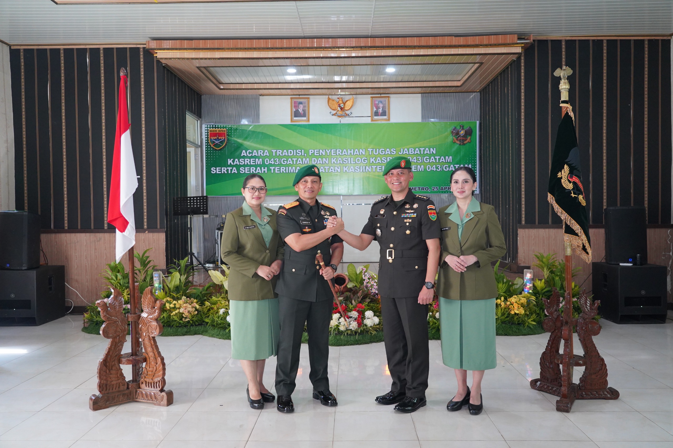 Kegiatan yang berlangsung di Makorem 043/Gatam, Jalan Veteran, Hadimulyo Barat, Kota Metro, itu menandai penyerahan tugas jabatan Kasrem kepada Kolonel Kav Roli Dewanto, S.E., M.Tr (Han), serta Kasilog kepada Kolonel Inf Agung Budhi Purnomo. Sementara itu, jabatan Kasiintel diserahterimakan dari Kolonel Inf Harizoni Pulungan, S.E., kepada Letkol Inf Jarot Susanto, S.H., M.Si.